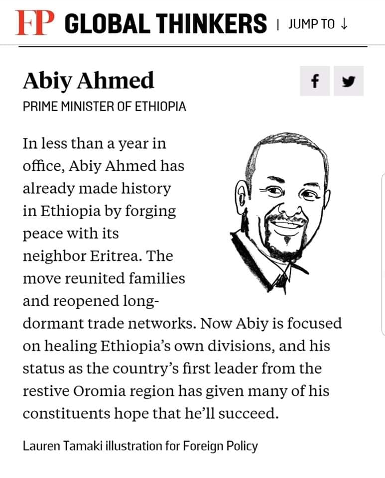ጠቅላይ ሚኒስትር ዶ/ር አብይ አህመድ የ2019 የአለም አቀፍ አሰላሳዮች መድረክ ተሸላሚ ሆኑ፡፡ የአለም አቀፍ የአሳቢዎች መድረክ (Global Thinkers Forum) ጠቅላይ ሚኒስትር አብይ አህመድን ተሸላሚ ያደረጋቸው ከፍተኛ የሆነ የማሰብ ችሎታቸውን በመጠቀም ሃላፊነታቸውን በብቃት ተወጥተዋል ብሎ ነው። በ2012 የተመሰረተው ይኸው ለግለሰቦችና መሪዎች እውቅናና ሽልማት የሚሰጠው አለም አቀፍ የሽልማት ድርጅት በ24 በተለያዩ ዘርፎች በ2019 ተሸላሚ ናቸው ካላቸው ግለሰቦችና […]